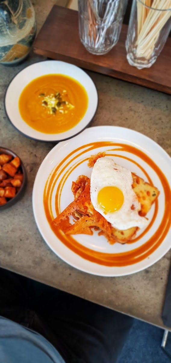 It’s not every day you stumble upon a brunch spot in a city you’re just visiting that not only serves incredible food but also embodies true hospitality. It was a cloud-covered Saturday afternoon when we joined the line outside this restaurant. What truly left an impression was how thoughtful and organized the staff was. They personally handed out umbrellas to everyone waiting in line, making sure no one was left standing in the rain unprotected. Despite their efforts, we still ended up drenched when it started pouring. To my surprise, even though we were dripping wet, the staff didn’t hesitate to invite us in. Rather than turning anyone away, they welcomed every guest with genuine warmth. They made sure the chairs were dried, offered towels, and seated everyone with a smile. It’s the little things like this that go a long way. It was honestly the complete opposite of what I’ve sadly come to expect from other places in Montreal. At most spots that I have been to, if you don’t speak French fluently, you’re either ignored, hung up on, or politely (and sometimes not-so-politely) asked to leave. This restaurant did not have a hint of that coldness. The staff spoke both French and English effortlessly, and treated everyone, locals and visitors alike, with respect and care. The food was just as comforting as the service. Every dish was perfect, and the coffee felt like a warm hug. The Yuzu French Toast was absolutely unforgettable. I had never tried vegan shakshouka before, but this one was truly exceptional, rich, flavorful, and utterly delicious. This spot is truly extraordinary. I would return again and again, not just for the food, but for the hospitality. Highly recommend!